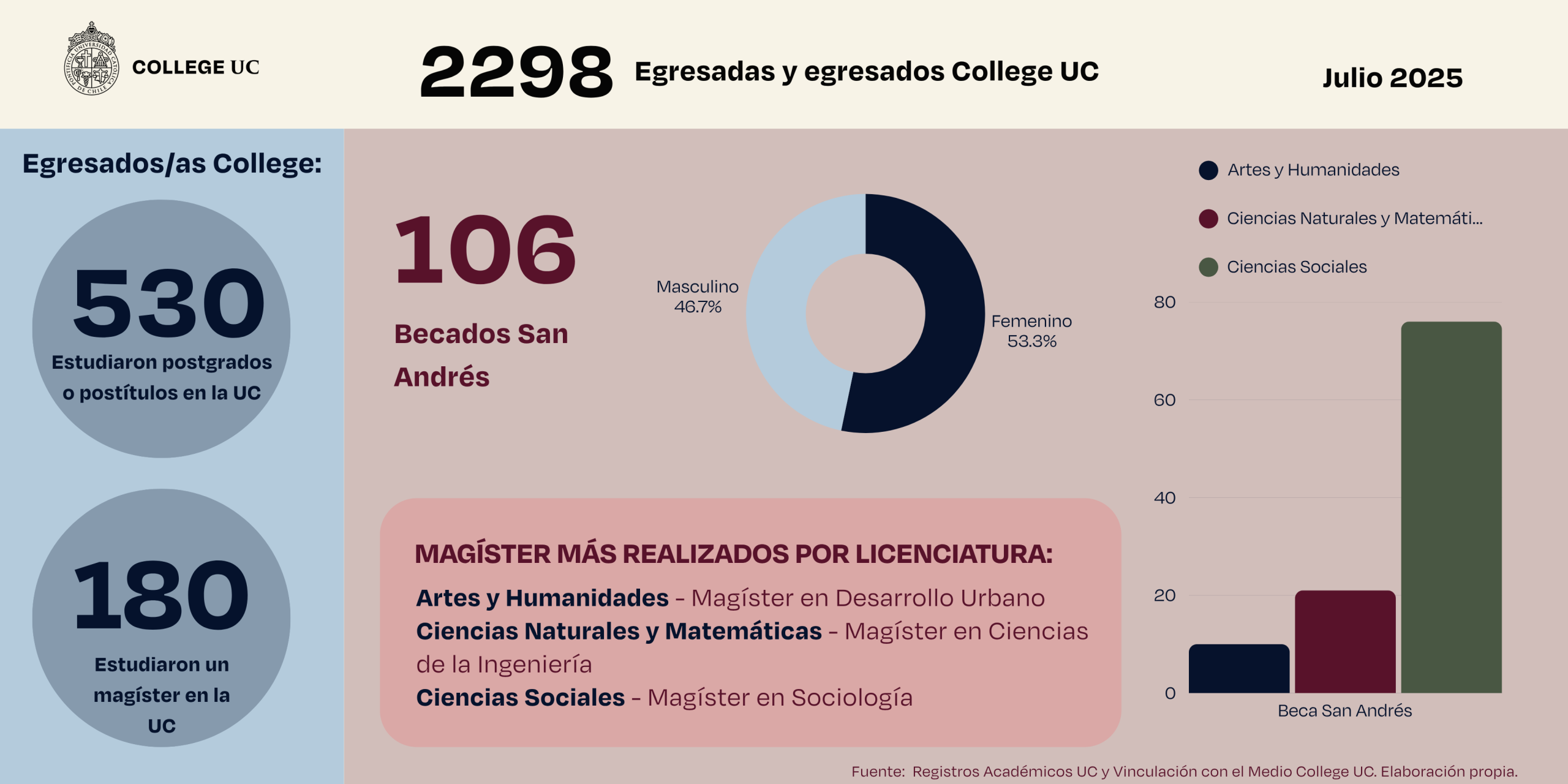 Desde 2014, la Beca San Andrés ha apoyado a egresados/as de College que desean continuar su camino académico en programas de magíster UC. En total, 106 estudiantes han sido favorecidos/as con este beneficio hasta este 2025.